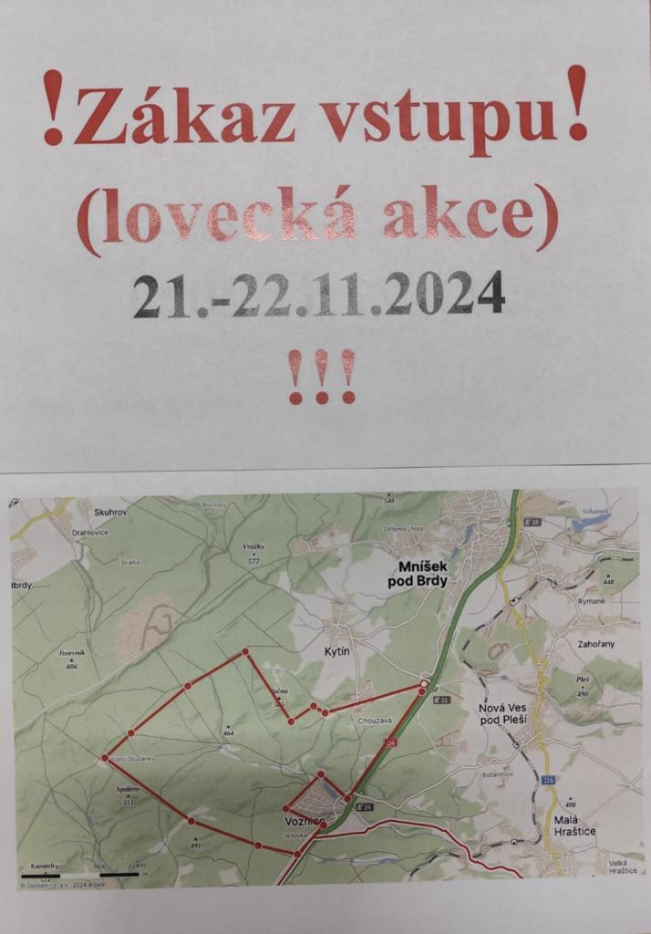 Zákaz vstupu do lesa v termínu viz výše z důvodu lovu černé zvěře, v místech označené na mapě