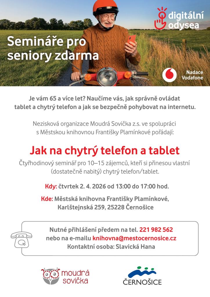 Nezisková organizace Moudrá Sovička z.s. ve spolupráci s Městskou knihovnou Františky Plamínkové v Černošicích připravila praktický seminář pro všechny, kteří si chtějí zlepšit dovednosti v práci s moderními technologiemi.