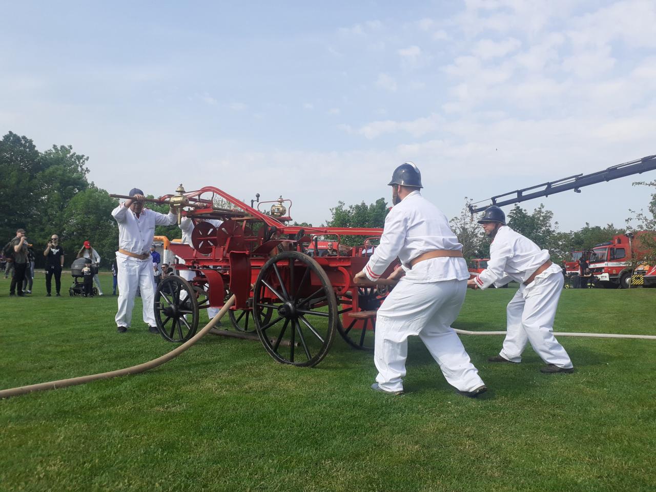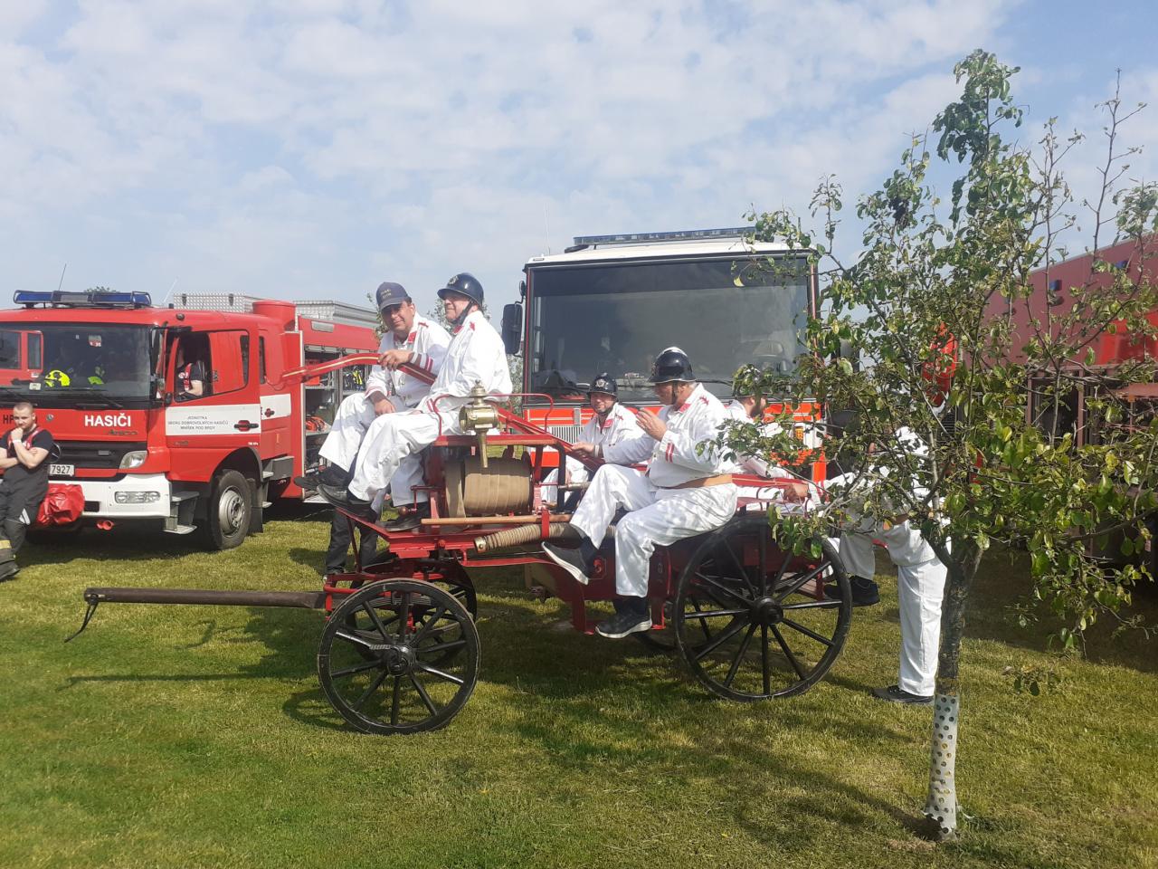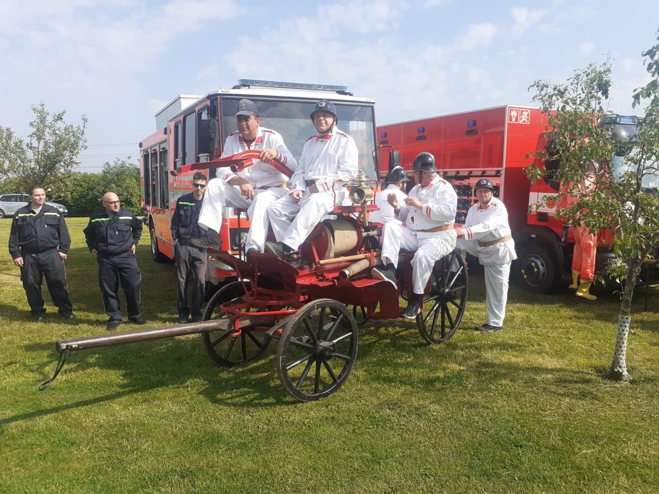 Provedli jsme dynamickou ukázku hašení hořícího domu (z palet) historickou koňskou stříkačkou.