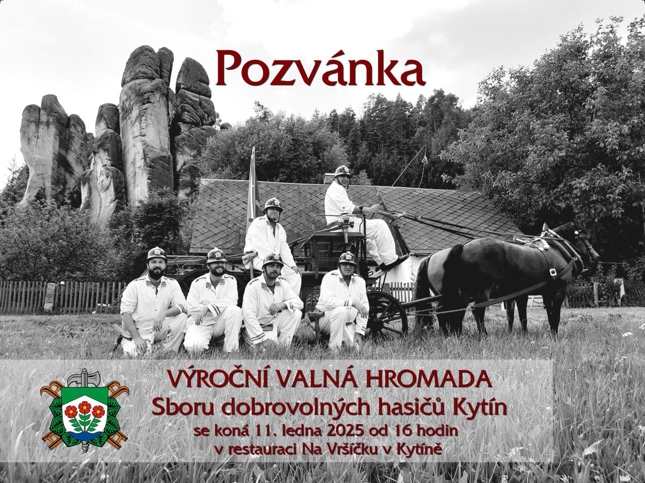 Zveme Vás na Výroční valnou hromadu sboru dobrovolných hasičů Kytín. Těšíme se na Vás.